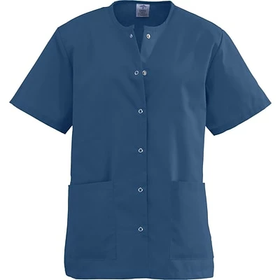 Ladies jewel neck scrub tops have two large pockets, one with a scissor holder which adds to this traditional scrub top. Cotton blend fabric is 55% cotton/45% polyester material.