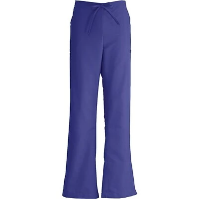 These mid-rise cargo scrub pants feature a boot cut leg and a combination drawstring and elastic waist