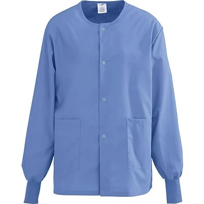 Keep your body warm at work with the unisex Medline AngelStat Ceil Blue Medium Scrub Jacket that is made from a cotton and polyester blend fabric for breathable comfort. This warm-up scrub jacket features two pockets for storing your important tools. One pocket also features a scissor holder for your convenience. This scrub jacket features matching ribbed cuffs that fit perfectly on wrists.