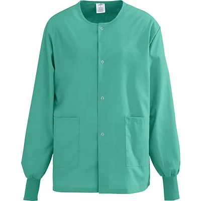 Keep your body warm at work with the unisex Medline AngelStat Jade Small Scrub Jacket that is made from a cotton and polyester blend fabric for breathable comfort. This warm-up scrub jacket features two pockets for storing your important tools. One pocket also features a scissor holder for your convenience. This scrub jacket features matching ribbed cuffs that fit perfectly on wrists.