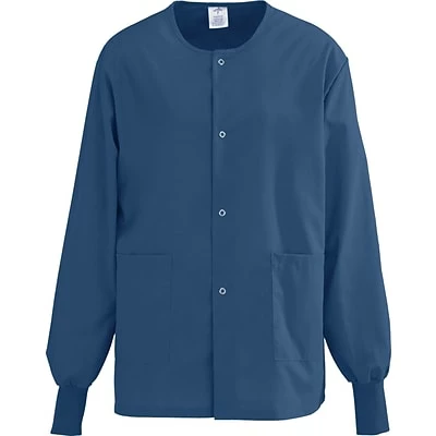 Keep your body warm at work with the unisex Medline AngelStat Navy Blue 5XL Scrub Jacket that is made from a cotton and polyester blend fabric for breathable comfort. This warm-up scrub jacket features two pockets for storing your important tools. One pocket also features a scissor holder for your convenience. This scrub jacket features matching ribbed cuffs that fit perfectly on wrists.
