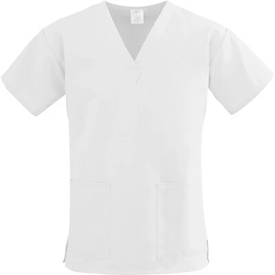 White women’s scrub top for use in for hospitals, clinics, surgical and other medical centers