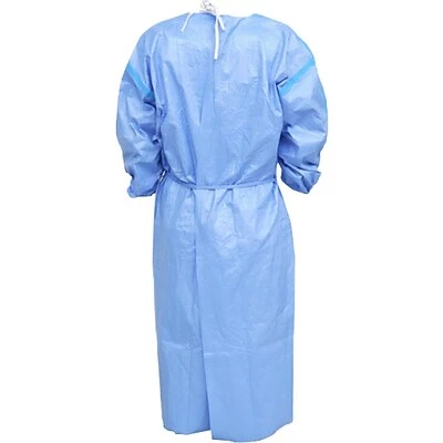 Blue isolation gown with coverage on the front, back, and sides provides protection with belt closure.